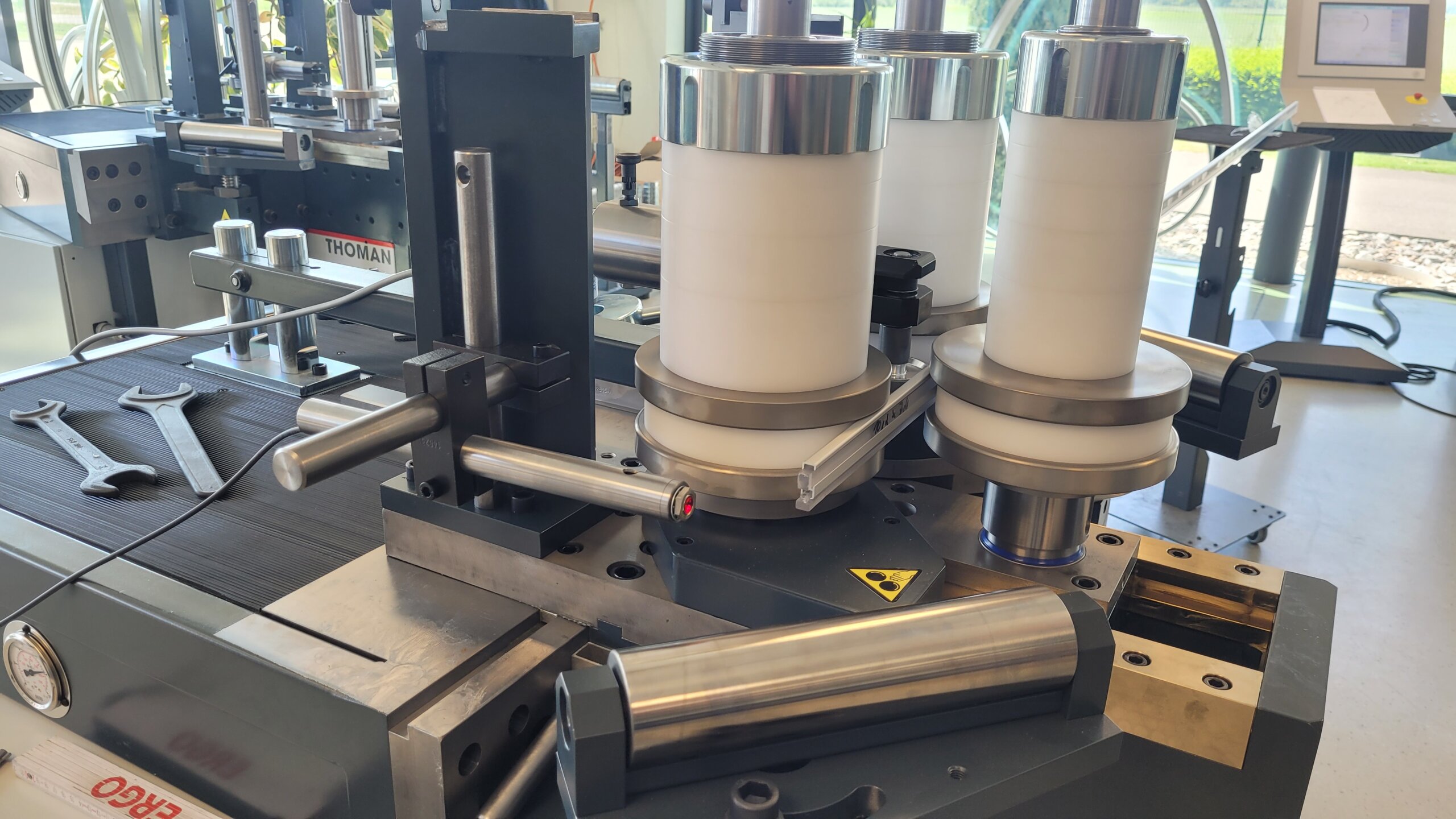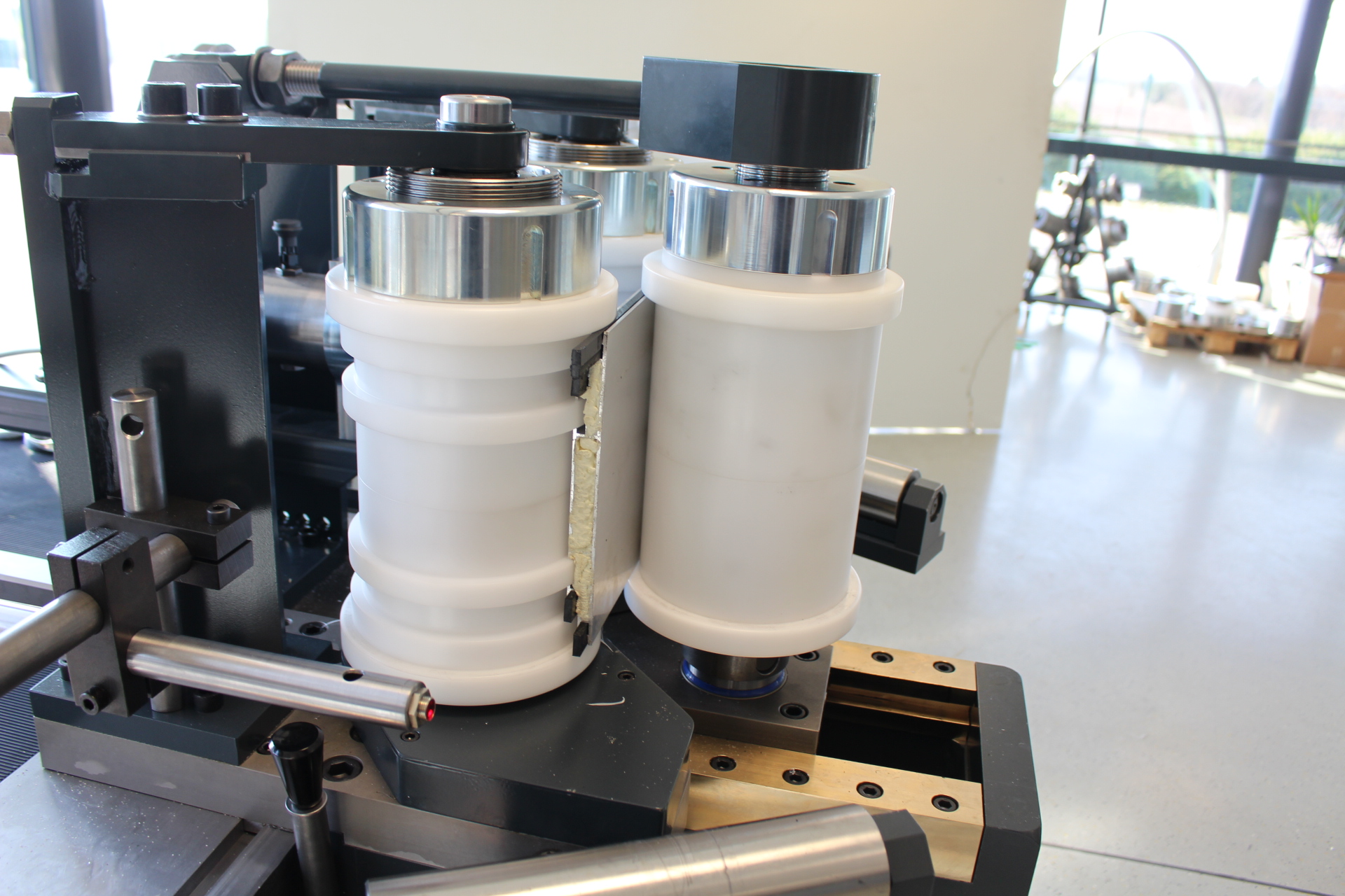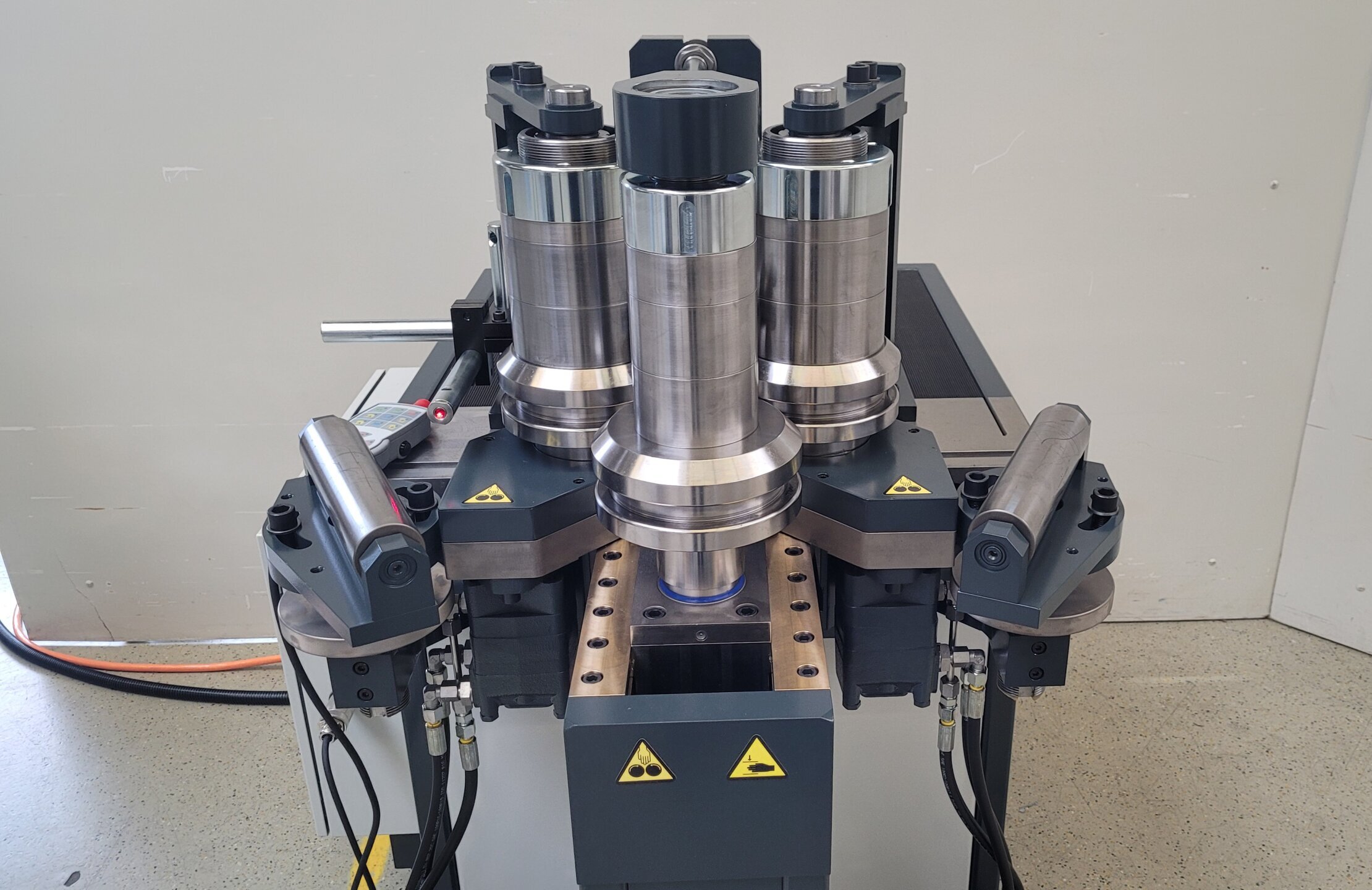Bei der Maschine ist ein minimaler Achsabstand von nur 200mm einstellbar. Dies ermöglicht die Fertigung von Biegekonturen mit sehr kleinen Biegeradien und sehr kurzen gerade Enden.