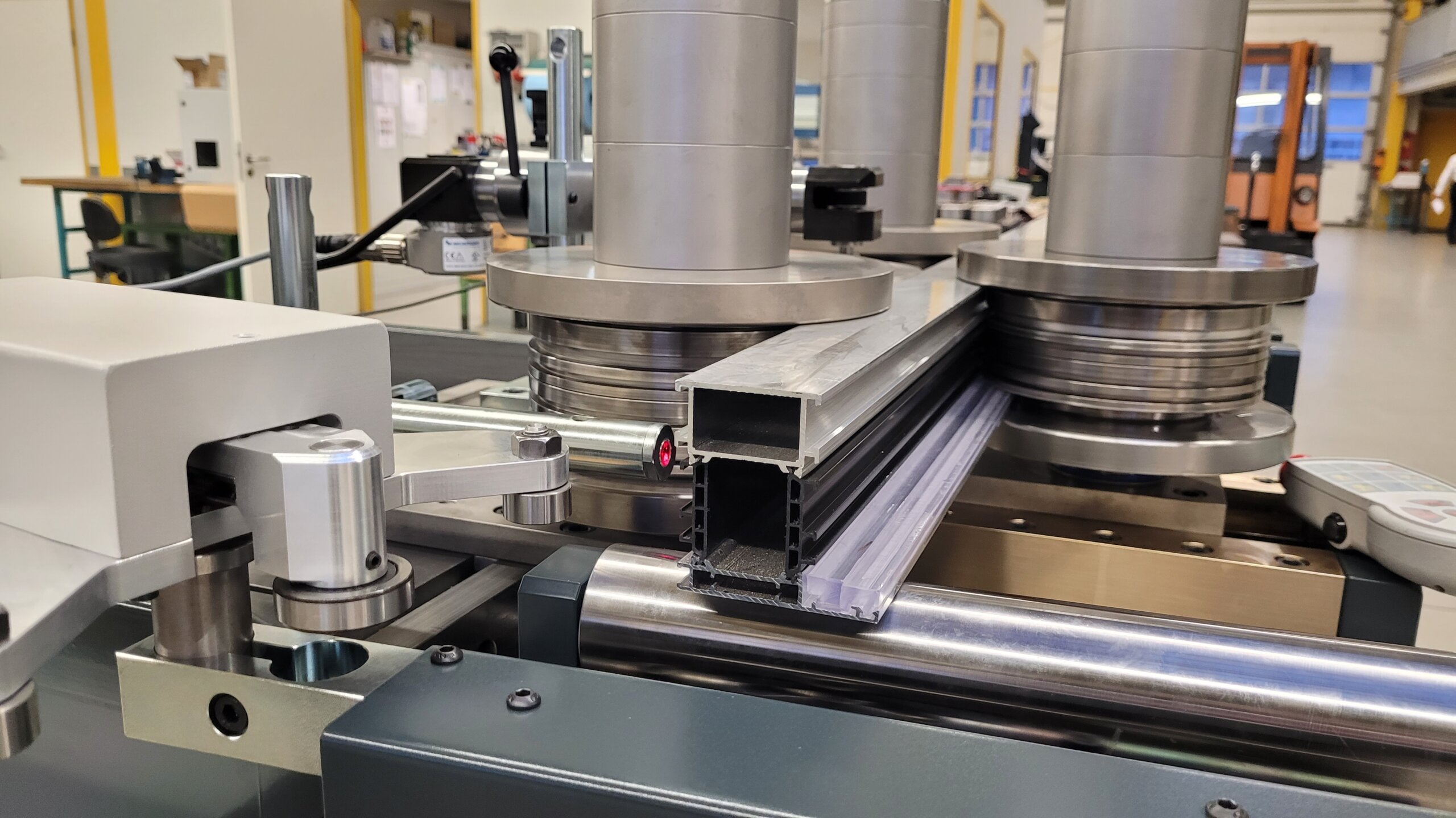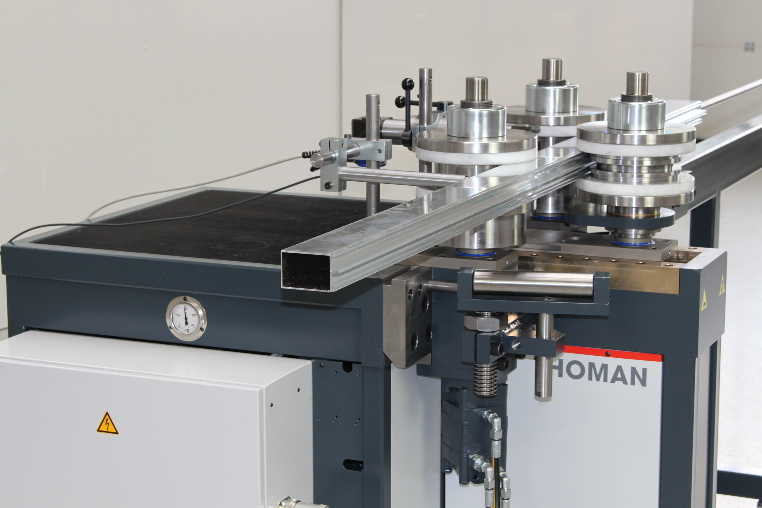 Es können glatte Walzen (ohne Riffelung) oder Walzrollen aus Kunststoff eingesetzt werden. Durch den variablen Achsabstand kann die Profilbiegemaschine optimal für das jeweils zu biegende Profil eingestellt werden. Zu hohe Presskräfte am Profil werden vermieden und es wird eine optimale Biegequalität erreicht.