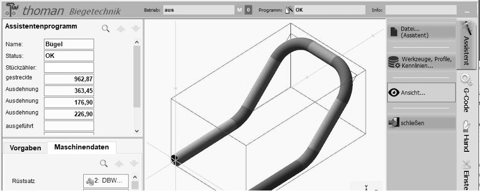 Ein wesentlicher Bestandteil der Steuerungssoftware für Rohrbiegemaschinen ist der 3D- Assistent. Der 3D –Assistent von Thoman ermöglicht eine besonders einfache und komfortable Eingabe der Biegekontur.